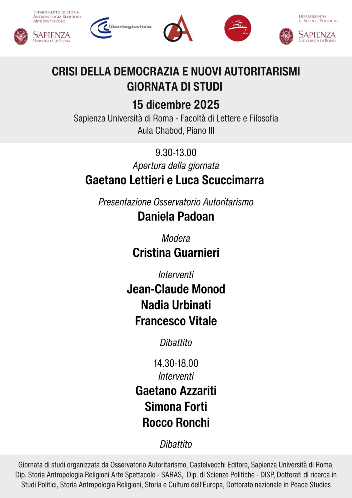 Dopo gli incontri all’Università degli Studi di Milano e all’Istituto Universitario Europeo di Firenze, questa giornata, organizzata in collaborazione con Sapienza Università di Roma, sarà dedicata al tema: Crisi della democrazia e nuovi autoritarismi.